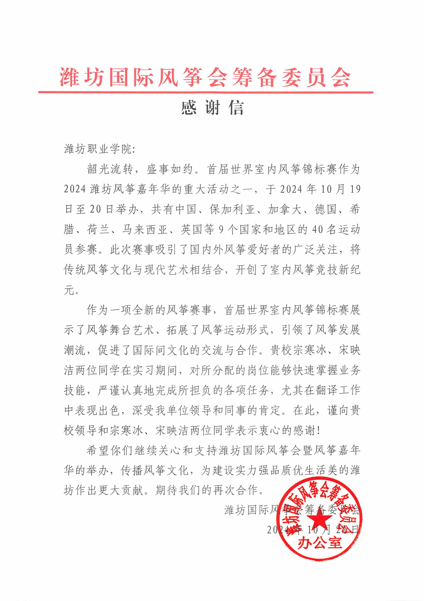 潍坊国际风筝会筹备委员会向我院发来感谢信