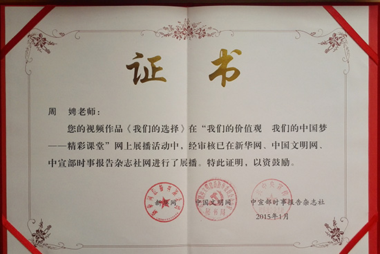 日前,中宣部、教育部、时事报告杂志社为参加全国“我们的价值观、我们的中国梦——精彩课堂”网上展播活动的教师颁发了证书。更多