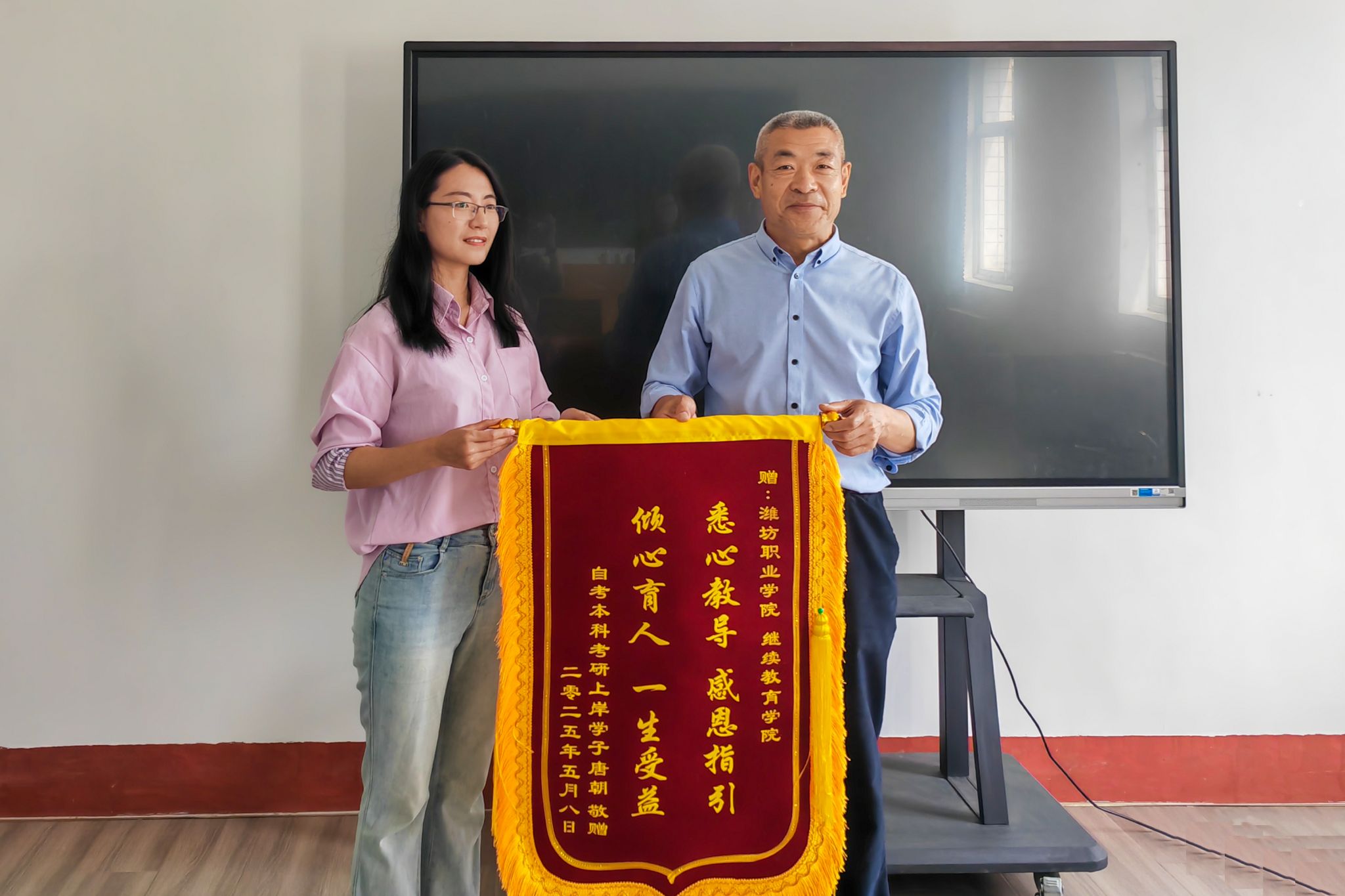 5月13日,学院举行了一场温馨的锦旗赠送仪式。2019级自考毕业生唐朝同学专程返回母校,将一面承载着感激之情的锦旗交到学院老师手中,感谢学院在其从专科到自考本科、成功考取研究生的求学路上给予的支持与帮助。继续教育学院主要负责人及教师代表共同见证了这一暖心时刻。仪式现场,老师们向唐朝同学通过自考本科平台实现考研“逆袭”致以热烈祝贺,对其饮水思源、回馈母校的行为给予高度赞誉。老师们一致表示:“学生的成功既是对自考教育质量的最佳印证,...更多 -