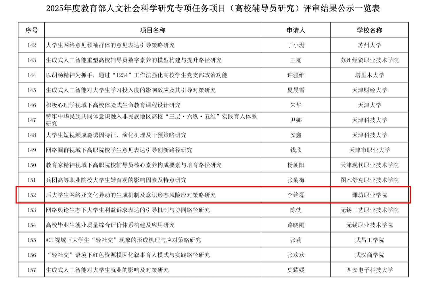 近日,教育部社会科学司对2025年度教育部人文社会科学研究项目和高校思想政治理论课教师研究专项项目的评审结果进行了公示,学院首次在该项目上获得2项拟立项,标志着学院在哲学社会科学研究领域取得重要突破。教育部人文社会科学研究项目是我国高校哲学社会科学领域具有高度权威性和重要影响力的科研项目,其立项情况不仅是衡量高校人文社科研究实力与创新能力的关键指标,也是推动高校科研工作服务国家战略需求、回应社会现实关切的重要载体。...更多 -