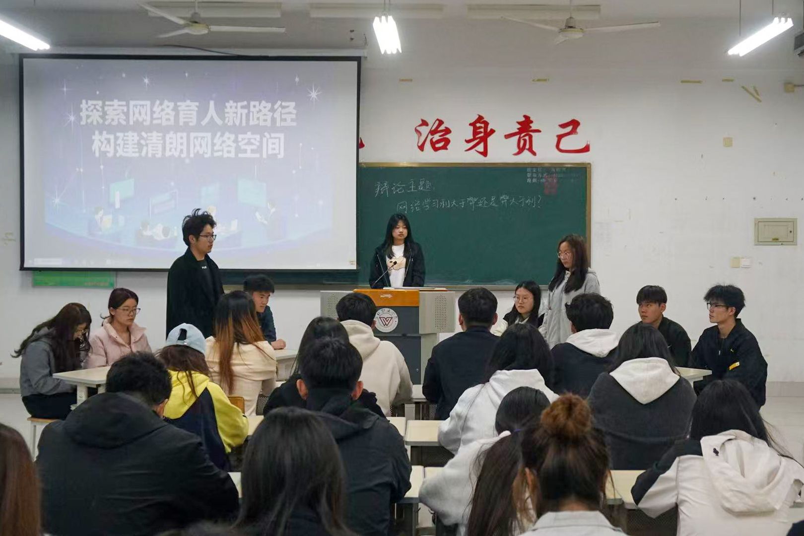 为提升同学们的网络素养与思辨能力,引导学生正确使用网络资源,探索网络思政教育新途径,共同营造清朗网络空间。化学工程学院于4月6日在惠泽1A412举办“探索网络育人新路径,构建清朗网络空间”主题辩论赛。比赛采用4人团队制,4支参赛队伍通过抽签决定正反方立场,围绕“网络学习利大于弊还是弊大于利”展开激烈辩论。比赛设置开篇陈词、攻辩、自由辩论等五个环节。正反双方辩手引经据典、妙语连珠,在思想碰撞中展现了出色的逻辑思维和语言表达能力,...更多 -