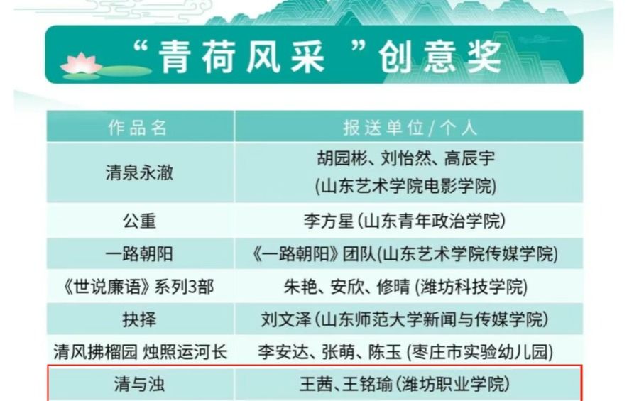 近日,由中国纪检监察杂志社、山东省纪委监委、山东省文学艺术界联合会、济南市纪委监委联合主办的第二届“青未了”杯廉洁文化作品创作大赛获奖名单正式揭晓,我院文化创意学院王茜、王铭瑜两位教师报送的《清与浊》凭借其独具匠心的创意脱颖而出,斩获“青荷风采”创意奖。作品《清与浊》紧扣大赛主题,通过融合传统艺术与现代设计语言,生动展现了廉洁文化的时代内涵。其作品以“青荷”为意象,用其象征“出淤泥而不染”的品格,呼应“...更多