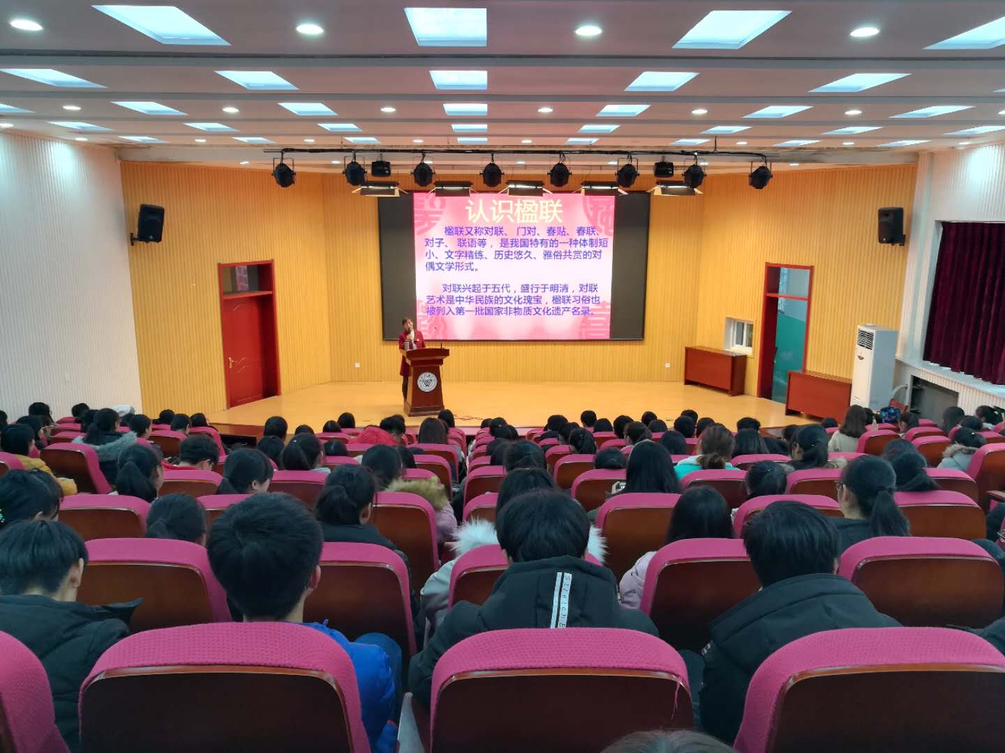 12月7日,学院第九场人文素养系列讲座在奎文校区创业中心报告厅举办,五年制高职部王晓华副教授作了题为“中华楹联趣谈”的报告会,200名学生聆听讲座。
