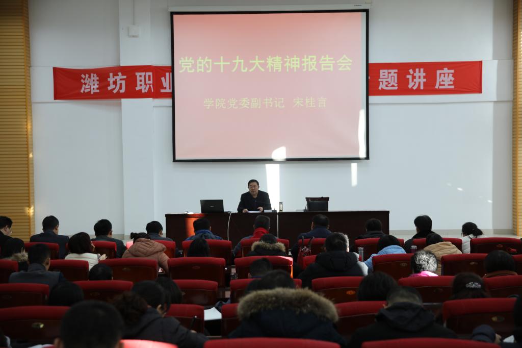 为深入学习宣传贯彻党的十九大精神,进一步推进“立德树人”根本任务,12月4日下午,学院党委副书记宋桂言在滨海校区清泽楼报告厅作了党的十九大精神宣讲报告。团委学生工作处相关人员,学院学生会全体成员,各二级学院(部)学生分会主席,各班团支书聆听了报告。