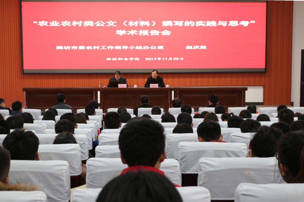 11月22日,我院邀请潍坊市委农村工作领导小组办公室赵庆胜副调研员在清泽楼报告厅作“农业农村类公文(材料)撰写的实践与思考”学术报告,副院长贺志强主持报告会,各职能部门教师代表、二级学院分管产学研工作人员及学生代表300余人聆听了报告。