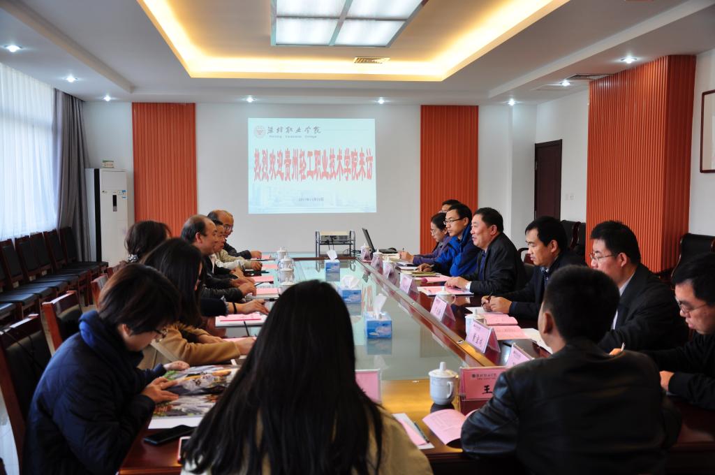 宋桂言就学院的办学历史及理念、学科专业设置、师资队伍建设、人才培养计划及近年学院取得办学成果进行了详细介绍,并陪同客人观看了学院宣传片。刘天德对我院的热情接待表示感谢,对我院的发展建设取得的成果表示赞赏并简要介绍了贵州轻工职业技术学院相关情况。双方部门负责同志就对口工作进行了深入交流。