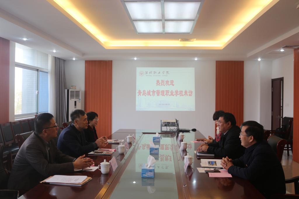 11月7日上午,青岛城市管理职业学校校长赵芳亮,副校长杨淑英一行3人来我院就合作办学相关事宜进行考察交流。院长王家爱在会议室接见客人。教务处、招生就业处负责同志参加座谈。