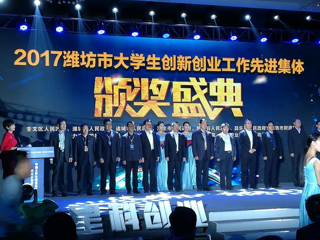 11月2日,由人力资源和社会保障部全国人才交流中心、山东省人力资源和社会保障厅指导,潍坊市人力资源和社会保障局、高密市人民政府主办的中国大学生精准就业服务暨返乡创业大会在潍坊高密举行。会上对2017年大学生创新创业工作先进集体、先进个人等进行表彰,学院荣获“潍坊市大学生创新创业工作先进集体”称号。全市有12个单位被授予“潍坊市大学生创新创业工作先进集体”称号。