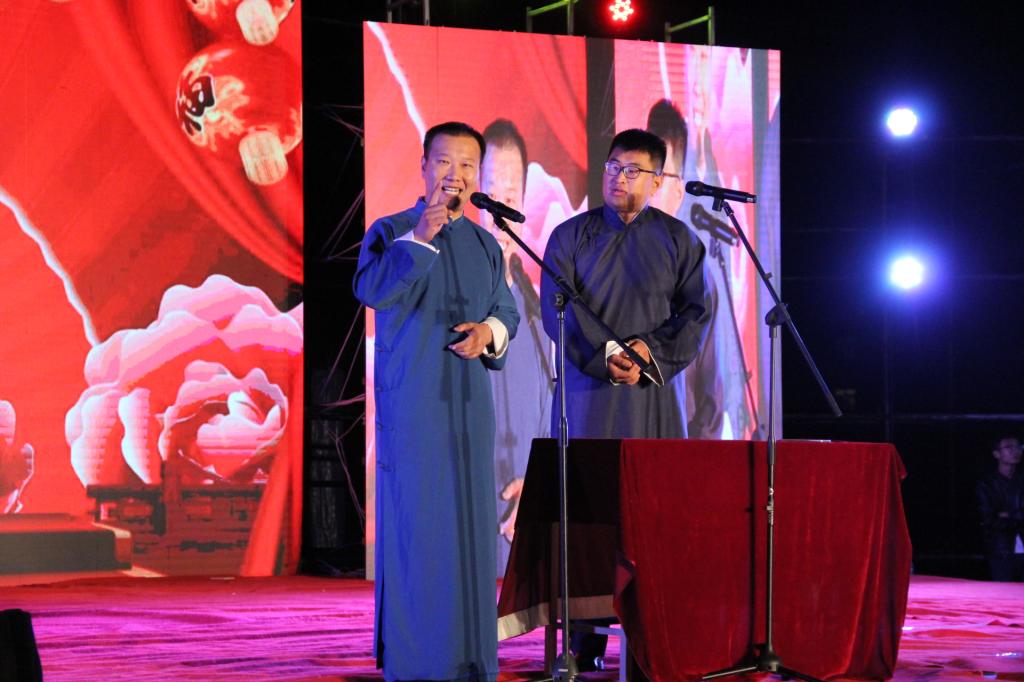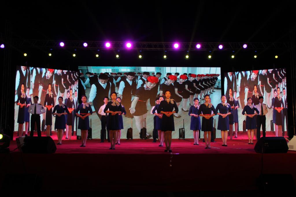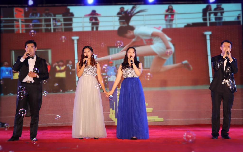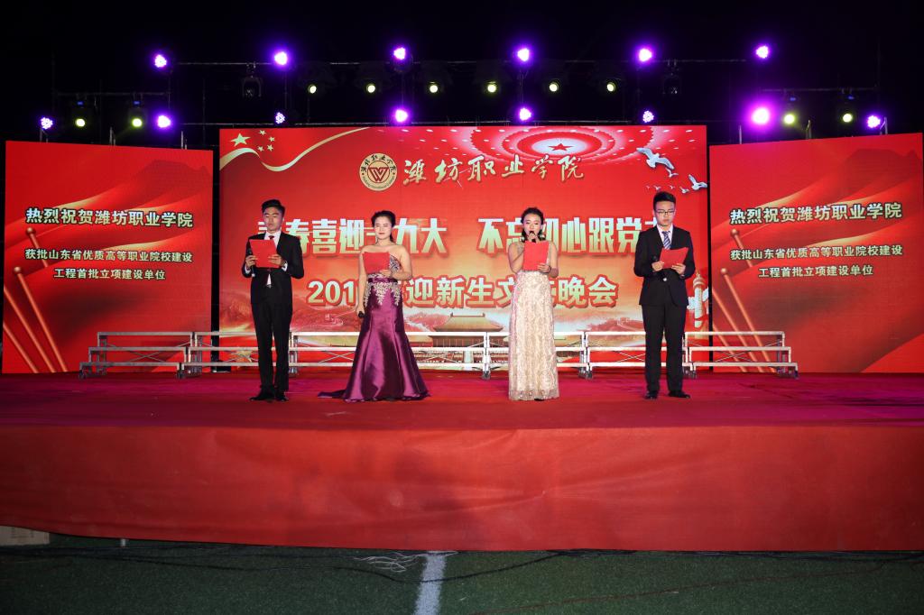 迎新晚会在气势磅礴的开场舞《鼓舞》中拉开了序幕。党旗飘扬,军歌嘹亮,两校区分别以《中国人民解放军军歌》、《强军战歌》、《走向复兴》、《四渡赤水出奇兵》军歌大合唱向在90年峥嵘岁月、砥砺前行的中国人民解放军致敬。随后的歌舞《国家》以跌宕的旋律,欢快的音调、昂扬的斗志和绚丽的舞姿,传递出师生对家与国真挚深切的体味;《美丽中国梦》唱出了中华民族的沧桑历程,歌颂了中华民族开创美好未来的非凡壮举;朗诵《少年中国说》展现出潍职学子的蓬勃朝气、赤子情怀;舞蹈《那些没必要想起,但绝不能忘记的岁月》鼓励大家让逝去的岁月在回忆里沉淀,歌伴舞《奔跑》、《娱乐天空》、拉丁舞《梦幻青春》、现代舞《D ance Crew》展现了潍职学子的青春活力,歌曲串烧《潍职好声音》点燃了现场的激情,相声《微微一信》逗得观众捧腹大笑,男女生四重唱《潍职版南山南》、朗诵《潍职礼赞》带大家领略了潍职的美妙,情景剧《父亲的散文诗》引起了大家对父亲的思念,乐队《平凡之路》、《像飞一样自由》用动感的旋律将现场气氛推向了高潮。