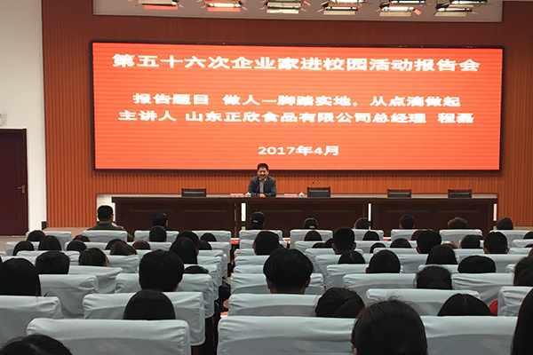 4月13日,学院第五十六次“企业家进校园”活动报告会在滨海校区清泽楼报告厅举行。山东正欣食品有限公司总经理程磊作了题为“做人——脚踏实地,从点滴做起”的报告。科技处人员、食品药品学院师生参加报告会。