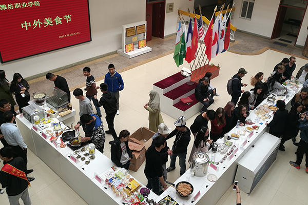 美食节现场,中外学生大显身手。展台上摆满了学生们精心制作的具有不同国家风味的特色美食,一边中国传统食品饺子、汤圆、粽子、毛蛋等纷纷登场,另一边是留学生们亲手做的哈萨克土豆饼、吉尔吉斯炒饭、日式饭团、乌兹别克烤肉和沙拉、巴基斯坦正宗奶茶和炸茄饼、法式三明治、俄罗斯饭等。留学生用在我院半年多时间学会的汉语热情招呼来往师生,美食佳肴获得了顾客们的称赞。