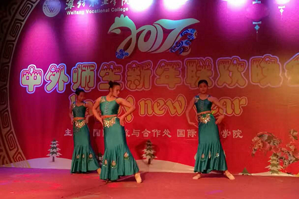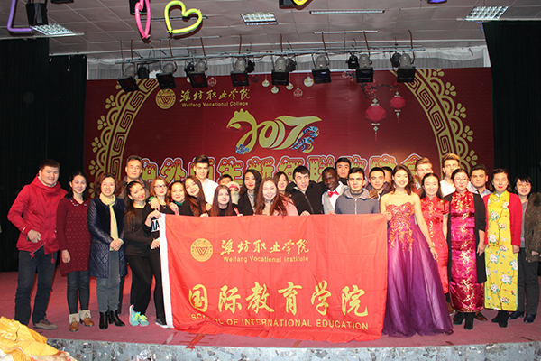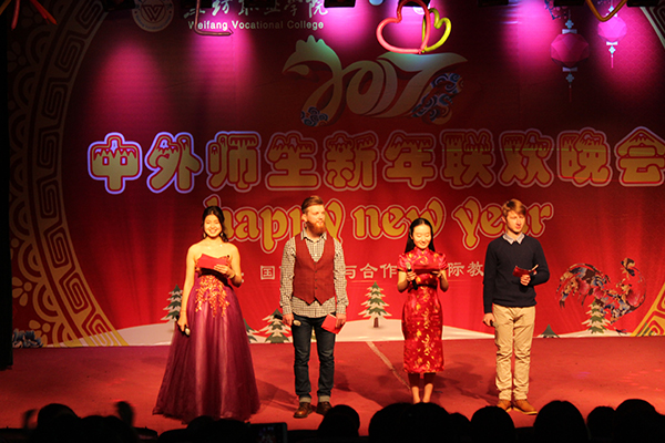 12月27日晚,我院2017年中外师生新年联欢晚会在奎文校区报告厅举行。奎文校区办公室、五年制高职部、国际交流与合作处的相关负责同志,以及新加坡商会驻潍企业代表、美国外教及中外师生500余人欢聚一堂,共同观看了晚会演出。