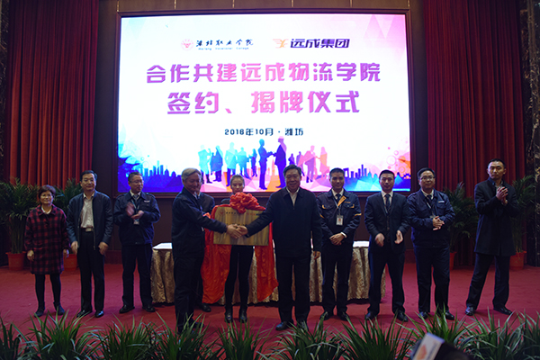 10月29日,我院与远成集团合作共建远成物流学院签约揭牌仪式在新富佳悦大酒店会议厅举行。学院党委书记张洪全、副院长赵君堂,远成快运集团总裁陈辉新,潍坊智慧物流城总经理吴国鹏,远成集团人力资源部副部长邹海,以及学院有关负责同志,远成快运集团、潍坊智慧物流城部分员工代表参加了仪式。