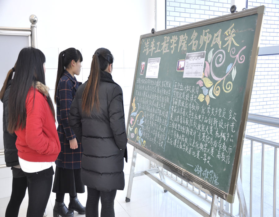 多彩的板报,文化的符号。各二级学院大学生以我为名校添光彩为动力,积极探索尝试,创新宣传形式,发挥才智自主设计,把贴近学生生活、融入时代特色、弘扬传统文化的小小板报办得风生水起:一则天气预报,一条时政要闻,让同学们知冷暖,观时事;一首应景的小诗,一幅优美的图画,让同学们驻足欣赏,拍照留念;一句激励人的名言,一则感人的好事,令同学们品评一番,啧啧点赞;让这片思想教育阵地重新焕发出新的生机与活力,成为广大学生积累丰富知识,培养合作精神,提高审美能力,传承优秀传统文化的展示平台。