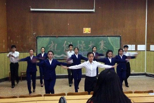 伴随着优雅的音乐,来自各二级学院的五支代表队,分别将站姿、走姿、蹲姿、鞠躬礼、送迎宾客编织成礼仪操,进行了全方位标准化展示。高雅的体态、优雅的举止、得体的手势,赏心悦目,极富美感。经过激烈角逐,经营管理学院获得第一名,国际商务学院获得第二名,信息工程学院获得第三名。(李雪琳供稿)