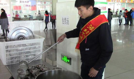 志愿者们分为四个小组,分别负责盛免费米粥、餐口卖饭、维持餐厅买饭秩序及收拾餐具。同学们在志愿者的协调下排队买饭,并依次领取免费米粥。同时餐口卖饭的志愿者仔细询问同学们的买饭需求,一份份热腾腾的饭菜递到打饭者的手中。餐具回收处,志愿者们认真回收并整理同学们用过的餐具,并提醒同学们注意勤俭节约。(郭大路供稿)