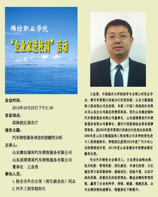 “企业家进校园”活动之三十八:山东潍坊璟和汽车销售服务有限公司董事长王念勇报告会