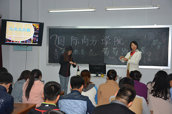 活动邀请到了潍坊华禾商贸有限公司的专业品酒师董洁为旅游管理专业的学生上了一堂题为“与舌尖共舞”的专业知识拓展课程。主讲人从葡萄酒的主要风格、常用酿酒葡萄品种及特点、葡萄酒健康、食品与葡萄酒的搭配等方面进行了讲解,同时也就WSET一级系统品酒方法进行了说明,特别对侍酒师礼仪和品酒礼仪进行了重点讲解。为了保证课堂效果,使学生对葡萄酒品鉴有更切身的体验,主讲人现场与学生们分享了葡萄酒,并进行了品鉴实践。主讲人生动的语言、丰富的专业知识、美的教态和多样的授课技巧使得整堂课气氛热烈、掌声不断,学生们听得津津有味。