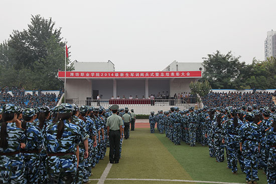 9月12日上午,我院2014级新生军训阅兵式暨总结表彰大会在奎文校区体育场举行。学院院长王家爱,驻潍某部副政委刘跃,奎文区人民武装部副部长许广晨,驻潍某部副营长、军训团团长郭仕宁,学院党委副书记宋桂言,学院副院长毕建华,学院纪委书记李瑞昌出席。阅兵式暨总结表彰大会由毕建华主持。