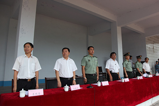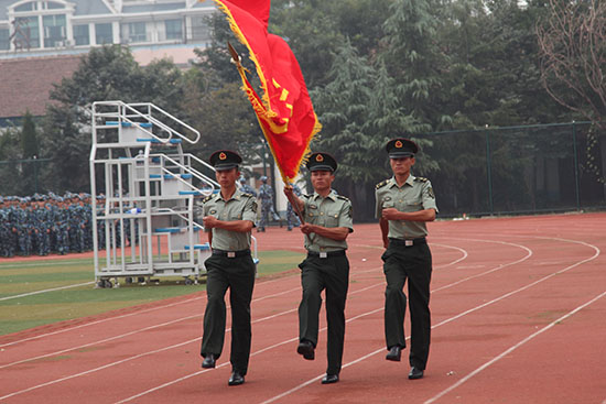 “迎军旗”的口令下达,迎风招展的军旗在三名护旗手的护送下走过主席台,到达阅兵方阵前排。王家爱在军训指挥员的陪同下检阅各方队。王家爱走过一个个方队前,向同学们致以亲切问候:“同学们好!”“同学们辛苦了!”同学们回答:“首长好!”“为人民服务!”。声音铿锵有力,响彻体育场上空。