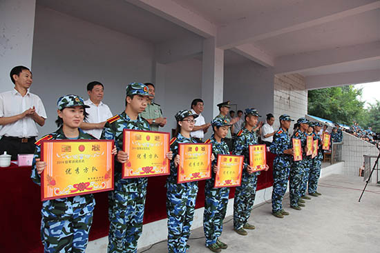 阅兵式结束,军训团团长郭仕宁宣布军训表彰通令。学院领导和部队首长为受表彰的军训先进集体和先进个人代表颁奖。