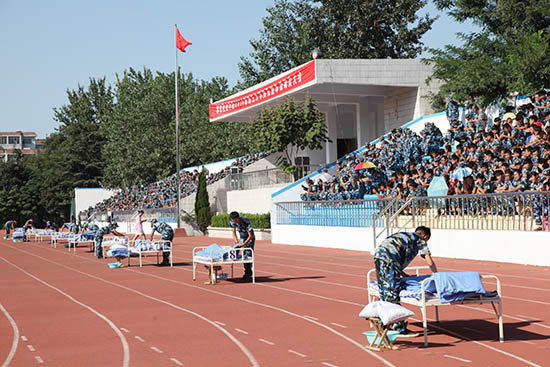 9月10日下午,2014级新生军训内务比赛在奎文校区体育场举行。军训团领导、团委学生工作处负责同志、各二级学院负责同志、辅导员(班主任)及2014级新生观看了比赛。