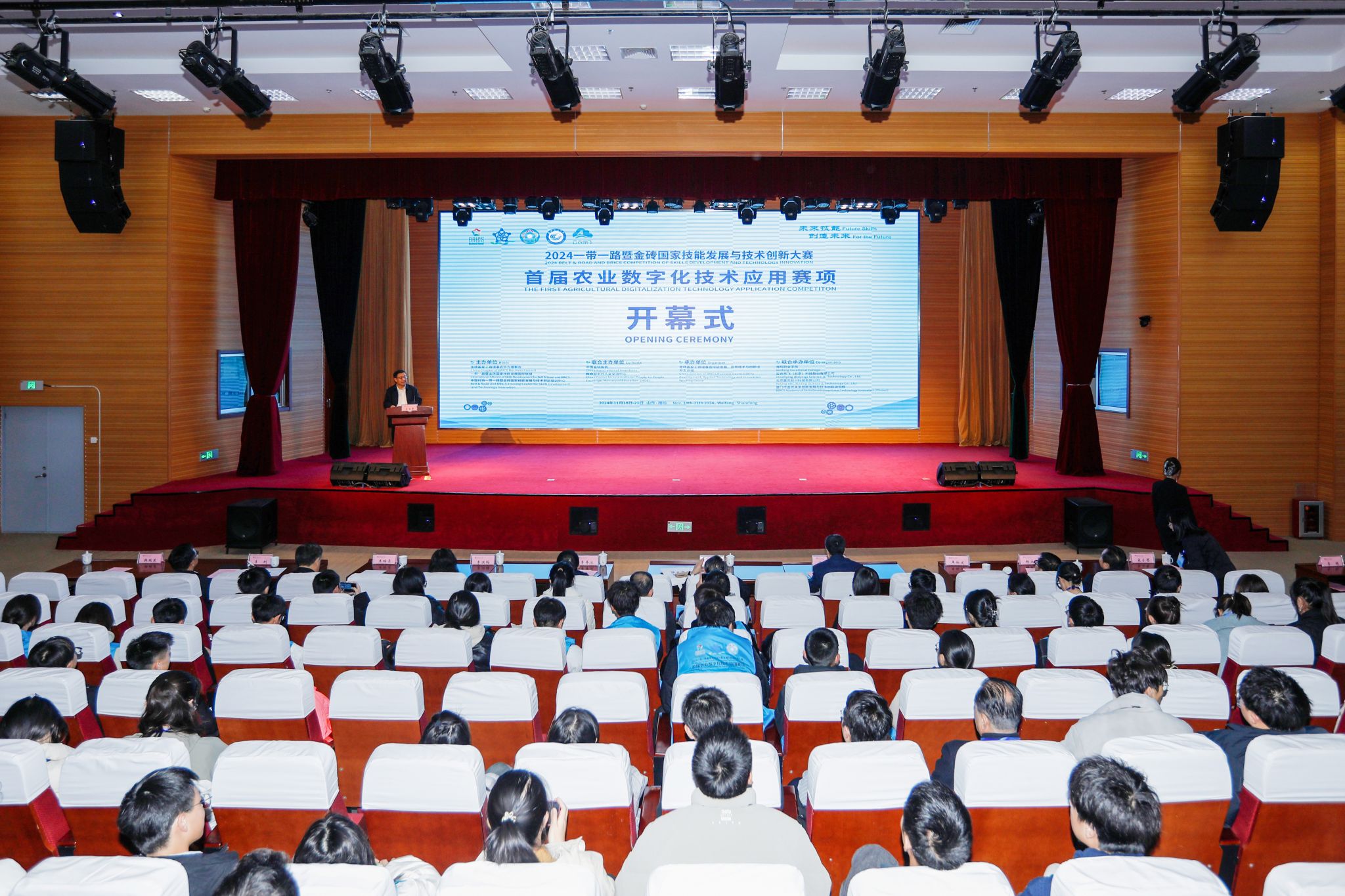 11月18日下午,2024一带一路暨金砖国家技能发展与技术创新大赛之首届农业数字化技术应用赛项在我院开幕。教育部职业教育与成人教育司原二级巡视员刘杰,人力资源和社会保障部原培训中心主任宋连辉,中央农业广播电视学校原总工程师王伯文,中国职业技术教育学会现代农业职业教育专业委员会副秘书长杨永杰,一带一路暨金砖国家技能发展国际联盟副秘书长宋小琴,山东省教育科学研究院职业教育研究中心主任李寿冰,山东省农业交流合作中心副主任、潍坊国家农业开放发展综合试验区副主任李洪梅,潍坊市人社局二级调研员王瑞亮,潍坊市职业教育发展研究中心主任李刚,赛项裁判长及大赛技术支持单位相关领导出席开幕式。来自全国的参赛选手、指导教师共150余人参加开幕式。开幕式由学院党委副书记韩瑞东主持。