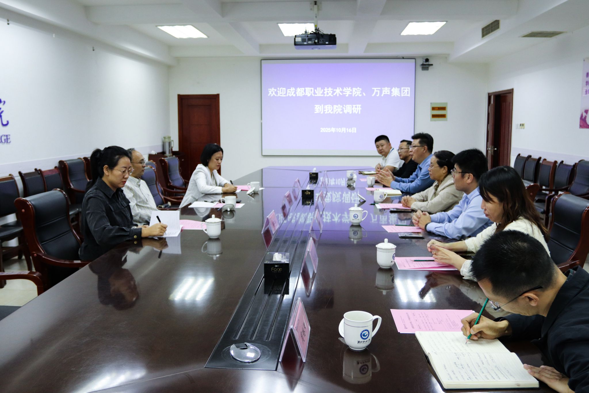 10月16日下午,成都职业技术学院党委委员、副校长任忠一行3人来我院考察,万声集团副总经理邱运乾陪同考察。学院党委委员高凌云陪同参观交流,文化创意学院主要负责同志及相关人员参与交流。