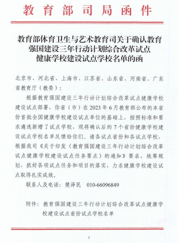 近日,教育部体育卫生与艺术教育司公布了《教育强国建设三年行动计划综合改革试点健康学校建设试点学校名单》,学院成功入选,标志着我院在健康教育与健康促进方面迈入国家层面试点建设新阶段。