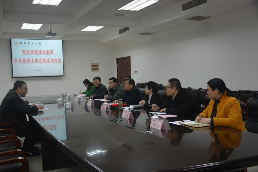 1月4日下午,澳大利亚华裔教育专家、中文教师联合会主席李复新博士一行两人莅临我院进行友好访问。副院长贺志强会见了客人,奎文校区管理办公室、科技处及国际商务学院相关负责同志参加了座谈。