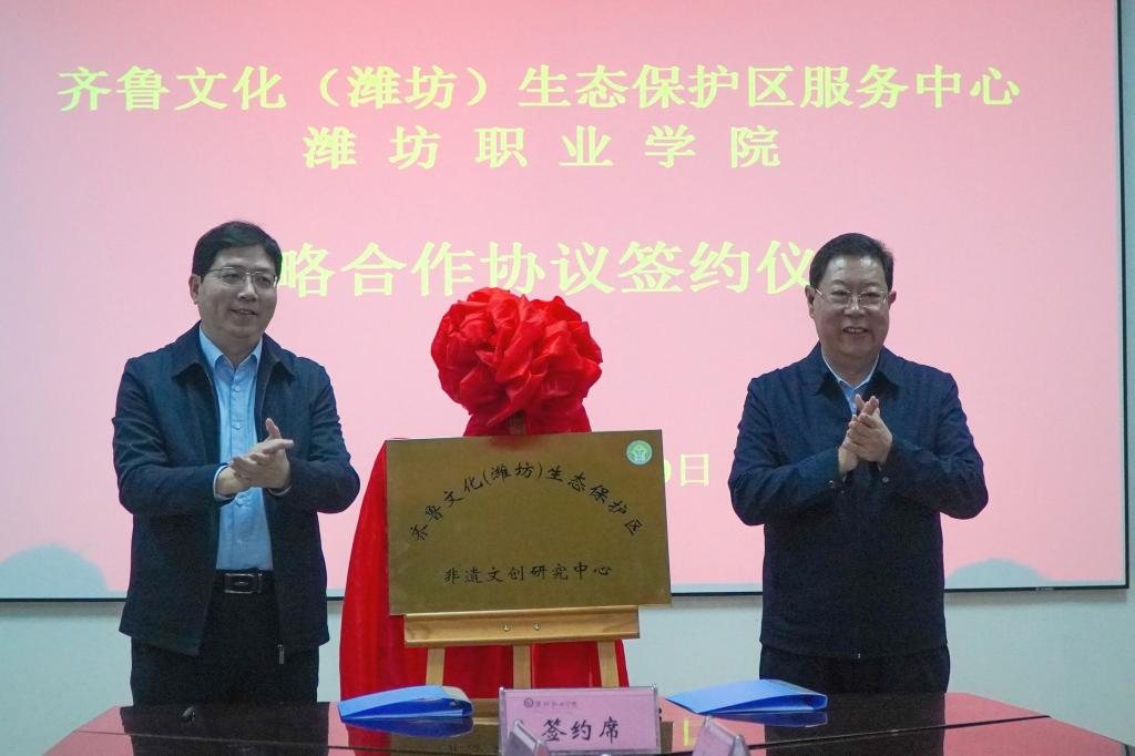 齐鲁文化(潍坊)生态保护区服务中心是国内首个以国家级文化生态保护区命名的公共文化服务机构。本着“资源共享、优势互补、注重实效、共谋发展”的原则,我院与齐鲁文化(潍坊)生态保护区服务中心签署战略合作协议,今后双方将在科学研究、人才交流、业务合作、实习实训等方面建立战略性、紧密型合作关系,实现人才、技术、资源的共享与互动,开展全方位的合作,进一步弘扬优秀传统文化、培养文化艺术人才、搭建实践交流平台、助力全民艺术普及、满足人民群众多元化精神文化需求,服务潍坊经济社会高质量发展。