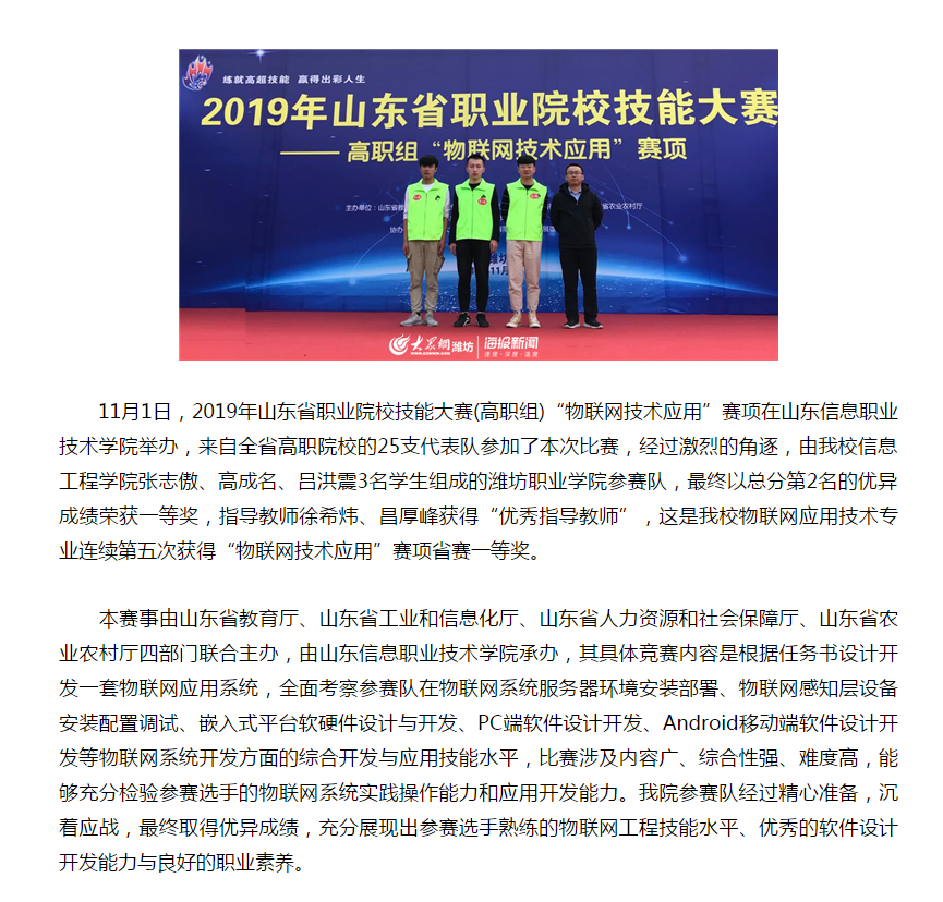 [大众网]开云体育APP下载网址获2019年山东省职业院校技能大赛“物联网技术应用”赛项一等奖