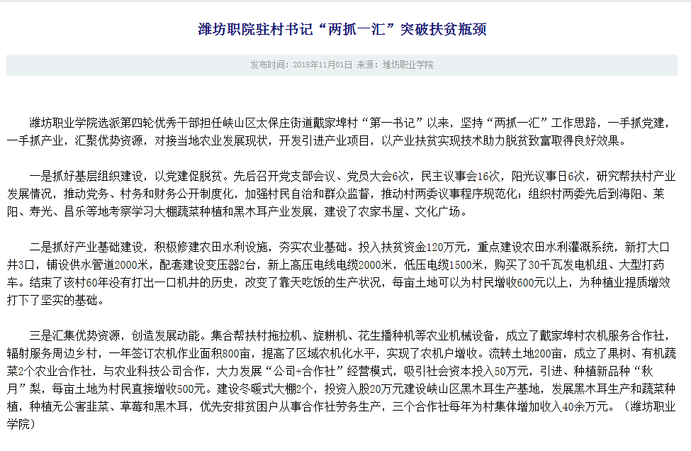 [山东省教育厅]潍坊职院驻村书记“两抓一汇”突破扶贫瓶颈