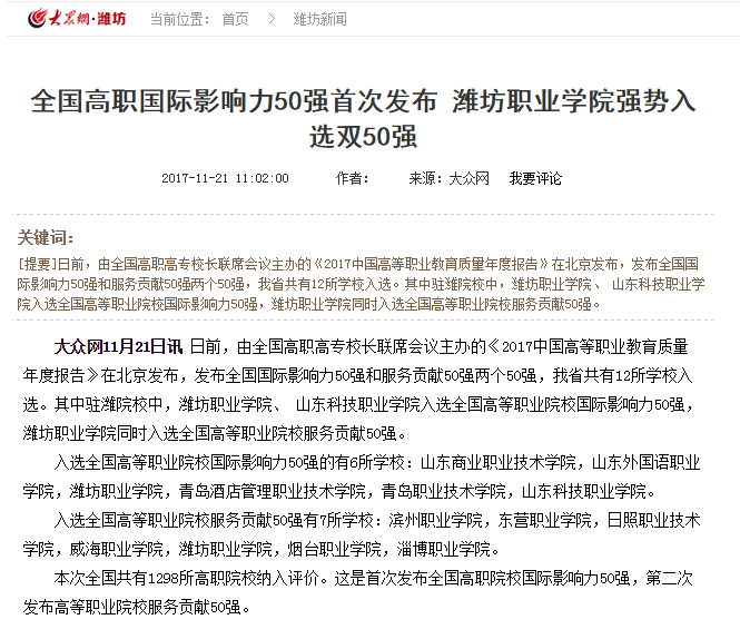 大众网11月21日讯日前,由全国高职高专校长联席会议主办的《2017中国高等职业教育质量年度报告》在北京发布,发布全国国际影响力50强和服务贡献50强两个50强,我省共有12所学校入选。其中驻潍院校中,开云体育APP下载网址、 山东科技职业学院入选全国高等职业院校国际影响力50强,开云体育APP下载网址同时入选全国高等职业院校服务贡献50强。