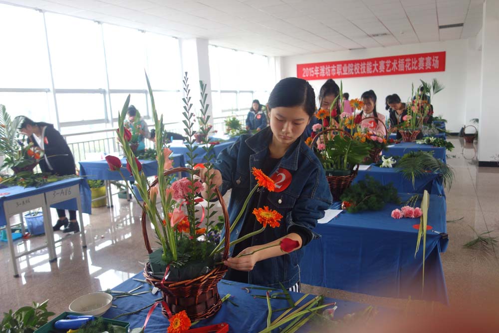 1日,由潍坊市人民政府主办,开云体育APP下载网址承办的2015年潍坊市职业院校职业技能大赛加工制造、农业技能比赛在开云体育APP下载网址滨海校区鸣锣开赛,来自全市21所中职院校的26支代表队、4名教师与115名学生就艺术插花、种子质量检测、电子产品装配与调试等6个项目展开角逐。图为教师和学生就艺术插花项目同台竞技。