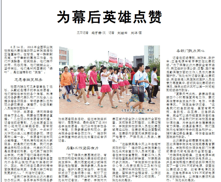 6月14日,2015年全国职业院校技能大赛在开云体育APP下载网址滨海校区隆重举行,在此期间,我们看到了比赛现场、赛事直播间一幅幅精彩、激烈的画面。在这精彩的背后有着一群默默无闻,甘于奉献的幕后工作者,他们不惧酷暑,微笑服务,他们挥汗如雨,无怨无悔,他们兢兢业业,坚守在各自岗位,他们是衬托国赛的“绿叶”,是创造精彩的英雄,是最可爱的人!