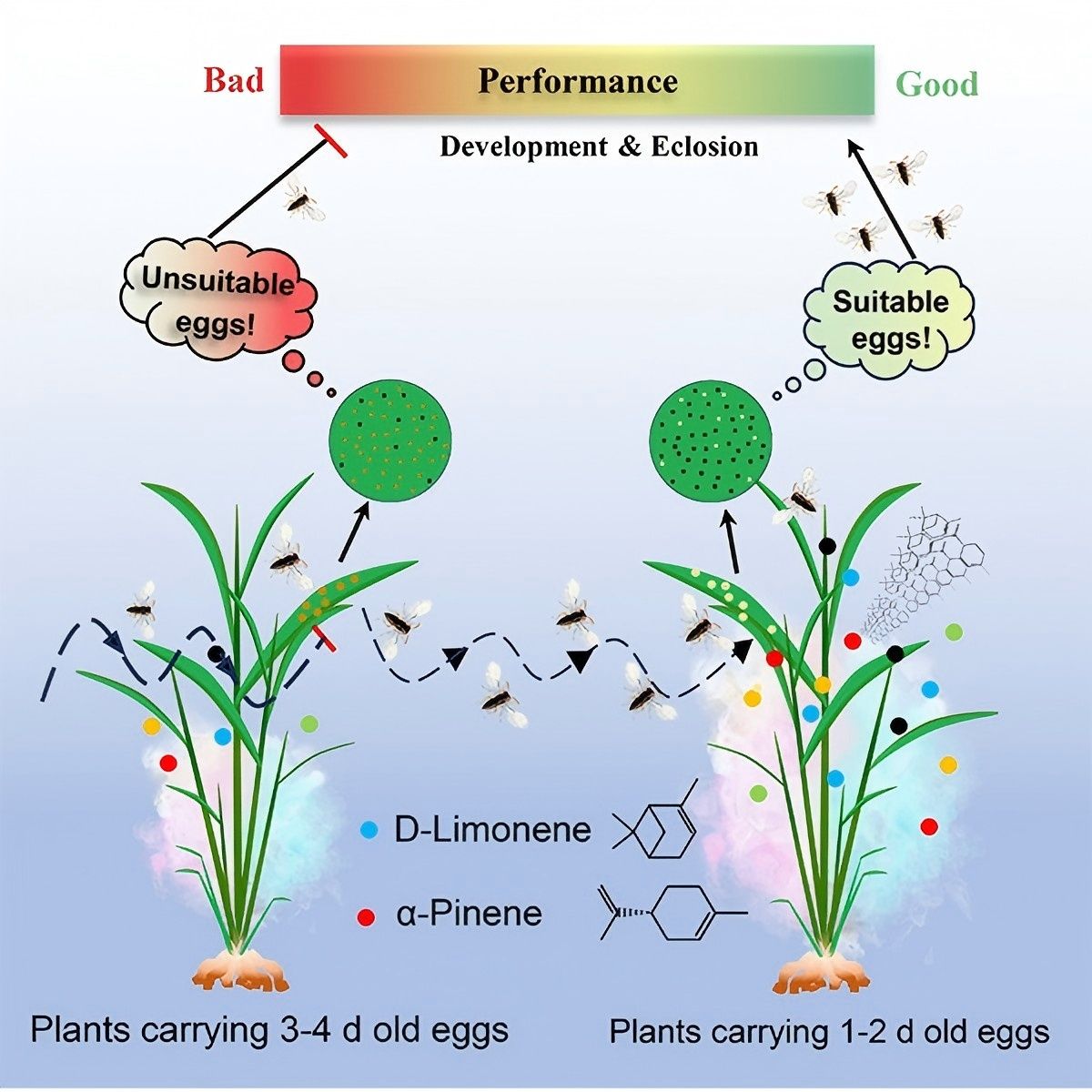 卵寄生蜂专门在寄主昆虫卵中发育,常被用于生物防治。在复杂的环境中,卵寄生蜂如何精确识别寄主卵并完成高效寄生的呢?该研究以“水稻-稻纵卷叶螟-稻螟赤眼蜂”为模型,创新性地发现卵寄生蜂在复杂生态系统中利用卵诱导植物挥发物鉴别寄主卵质量,从而提升后代生存适合度的寄生策略,并利用Y型嗅觉仪、GC-MS、CRISPER/Cas9等技术深入揭示了这一现象的生化和分子机制。这一发现打破了寄生蜂仅能利用植物挥发物远距离定位寄主生境,依赖触觉或视觉近距离线索鉴别寄主质量的传统认知,丰富了植物-害虫-天敌三营养级协同进化理论,为害虫的绿色防控提供了新的研究思路。(王园园 王玉莹供稿)