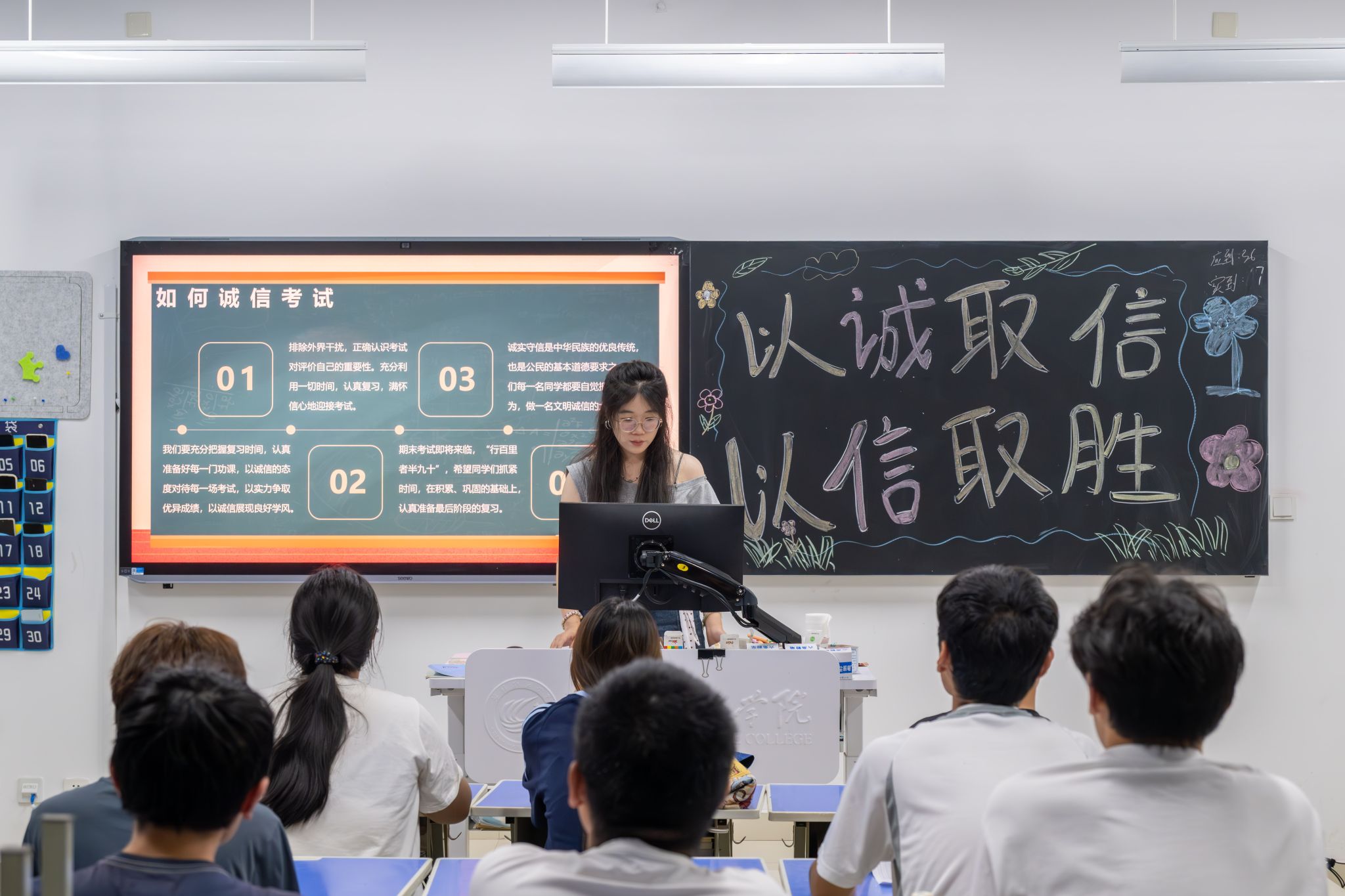 活动中,辅导员以班级为单位,围绕诚信考试核心主题展开教育。学生干部化身“诚信引航员”,通过分享阶梯式复习法、思维导图梳理知识等实用备考技巧,采用情景模拟形式强调考场纪律要求,全方位引导同学们树立正确考试观。同时,以“诚信是立身之本”为切入点,结合学业发展需求,鼓励同学们不抄袭、不作弊,用真实成绩检验学习成果。同学们认真聆听案例,积极参与“诚信考试利弊”主题讨论,结合个人经历分享诚信感悟。在随后的宣誓环节,全体同学郑重承诺严守考试纪律,以诚信态度迎接考试,并将诚信理念融入日常学习生活,争做诚信文化践行者。
