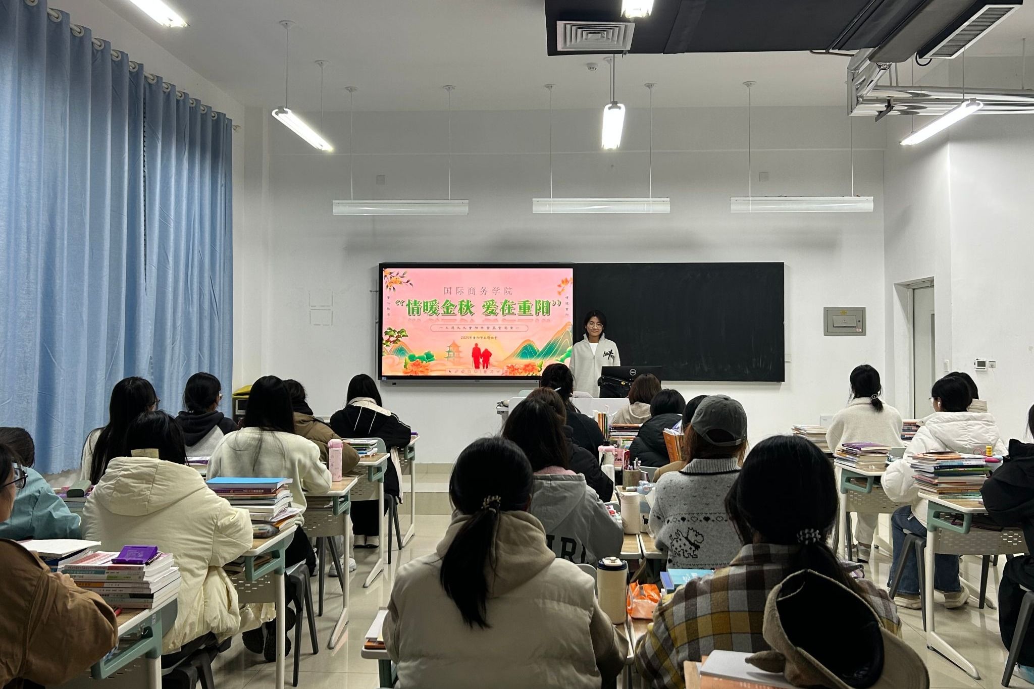 活动伊始,国际商务学院各班召开“情暖金秋,爱在重阳”主题班会。班会上,辅导员通过讲解重阳节的文化习俗、分享孝心故事等形式,将孝亲敬老的理念根植于学生的心中。在“连线话重阳”环节中,同学们纷纷与家人连线,送上了他们的节日问候,暖暖亲情在方寸屏幕间流淌。