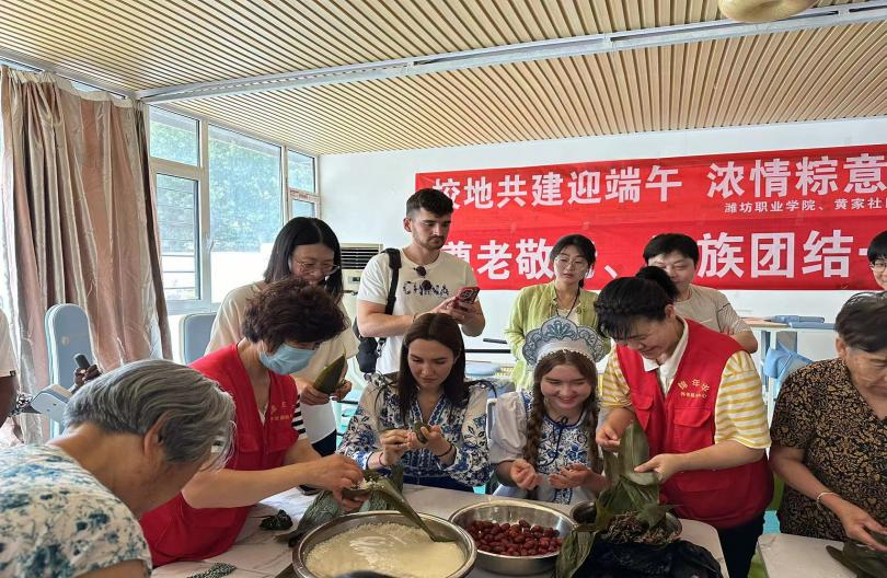 6月6日下午,学院联合奎文区潍州路街道黄家社区共同开展“校地共建迎端午 浓情粽意暖民心”端午节特别活动。来自加纳、俄罗斯、巴基斯坦等国家的21名留学生来到黄家社区锦年华养老服务中心参与活动。