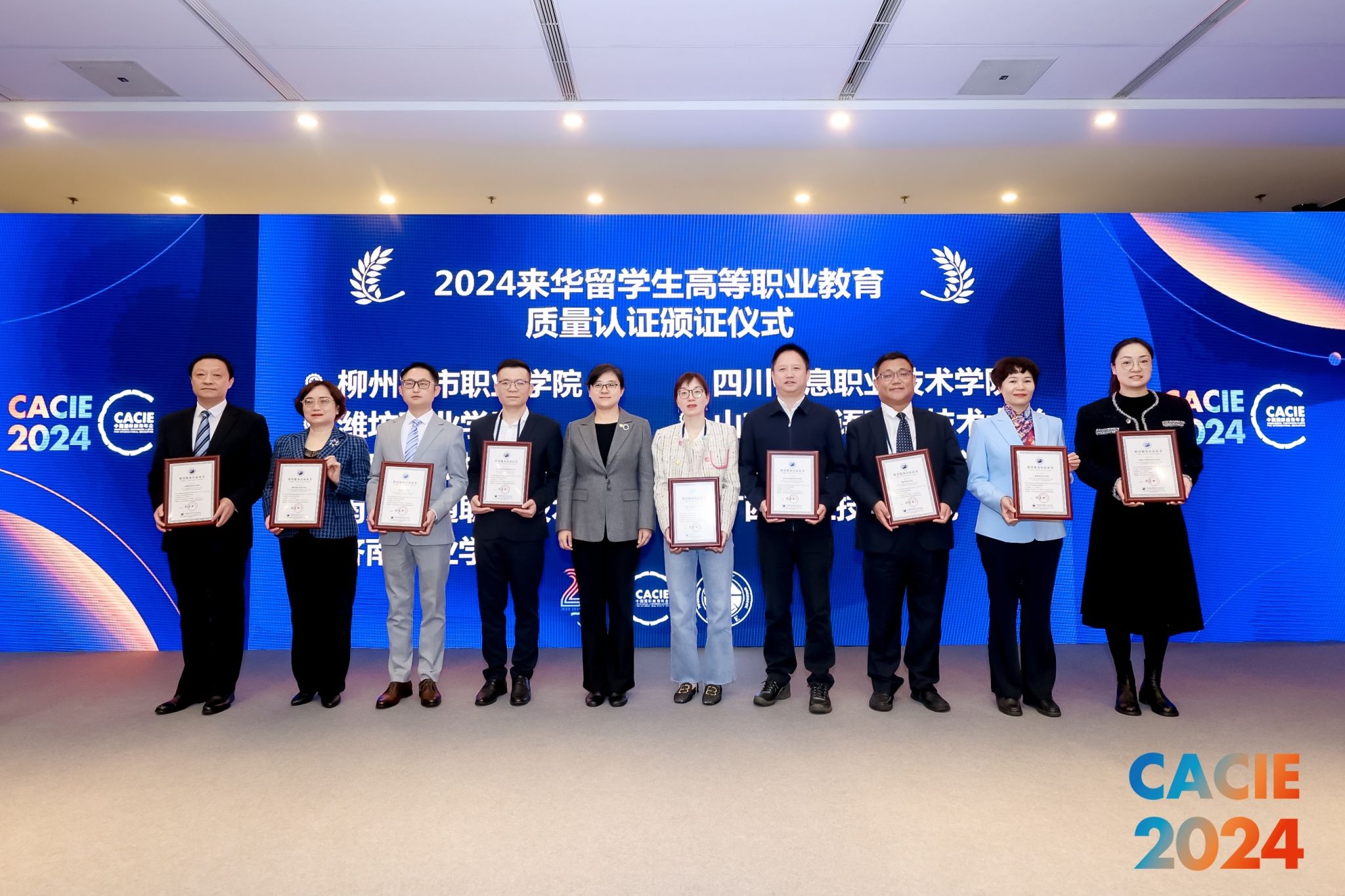 11月1日韩瑞东参加“培养当地人才、服务“走出去”企业——职业院校来华留学教育研讨会”分论坛。会上举行了来华留学生高等职业教育质量认证颁证仪式,开云体育APP下载网址以优异成绩通过来华留学生高等职业教育质量认证,认证有效期为4年,中国教育国际交流协会副秘书长安延为学院颁发证书。