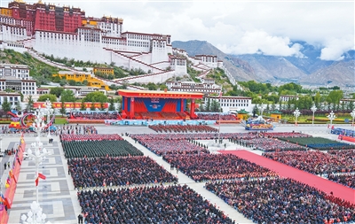 8月21日上午,西藏各族各界干部群众约2万人欢聚拉萨市布达拉宫广场,热烈庆祝西藏自治区成立60周年。这是庆祝大会现场。 索朗旺久摄(新华社发) |