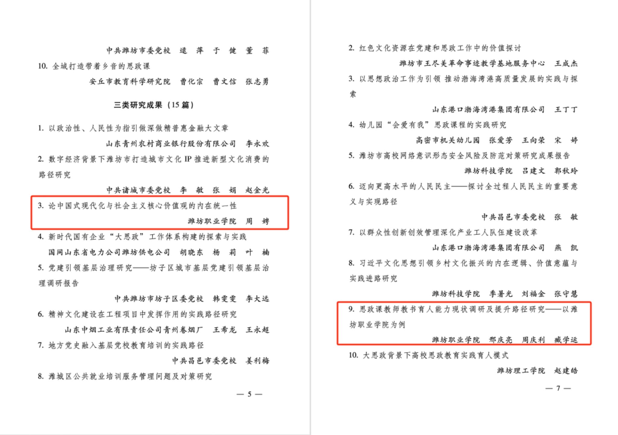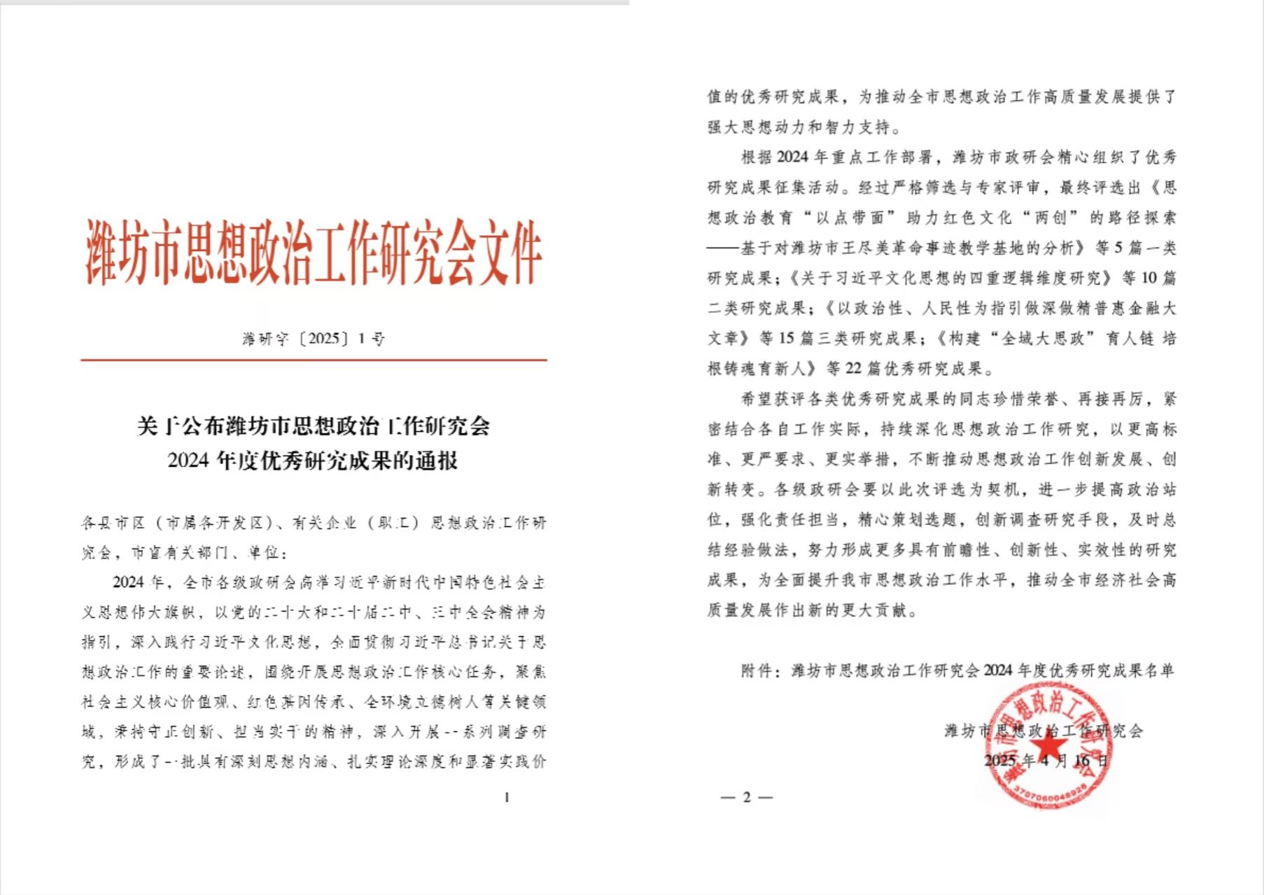 近日,潍坊市思想政治工作研究会公布了2024年度优秀研究成果评选结果,我院马克思主义学院申报的2项成果获奖。